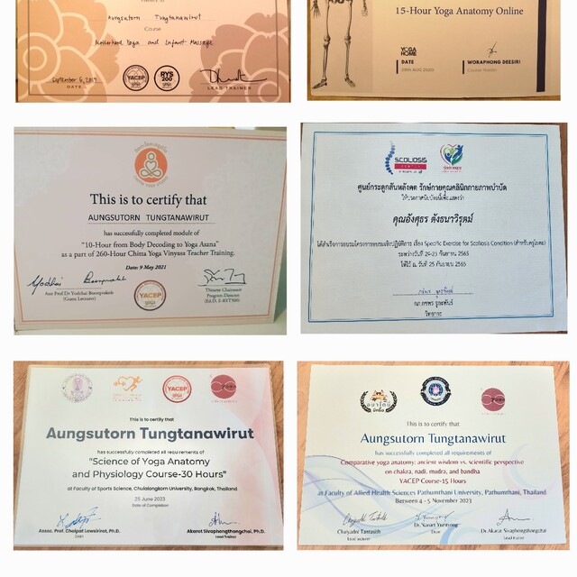 🧘Certified ครูโยคะและสถาบันเพื่อสุขภาพหลากหลาย ประสบการณ์มากกว่า 9ปี สามารถวิเคราะห์ร่างกายผู้ฝึกและออกแบบการสอนเพื่อบำบัดฟื้นฟู เฉพาะบุคคล