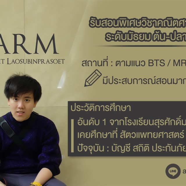 สวัสดีครับ ชื่ออาร์ม สอนคณิตศาสตร์ทุกระดับชั้นครับ