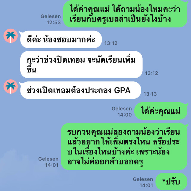 เบลล่าตอบกลับ:ขอบพระคุณน้องไมย่ามากค่ะ เป็นกำลังใจสำคัญมากเลยค่ะ คุณครูยินดีให้คำปรึกษา ตลอดนะคะ:)