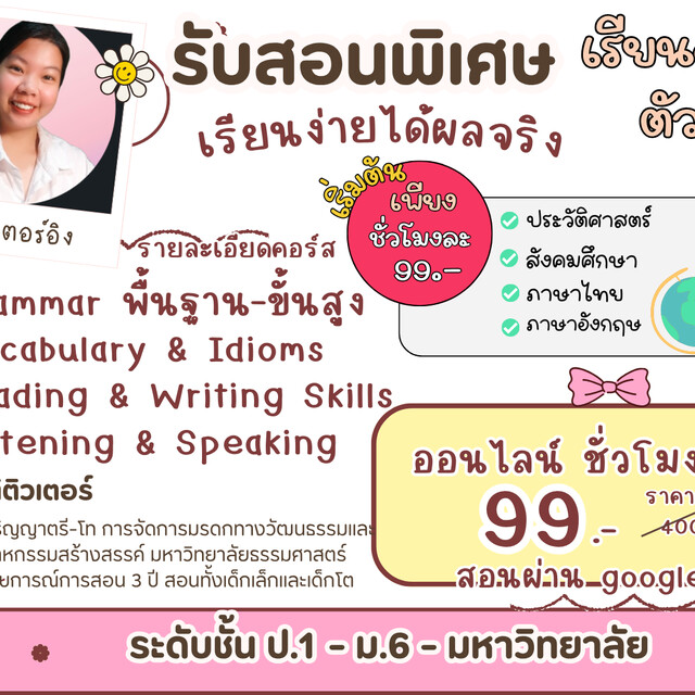 สวัสดีครับ ผมชื่อฟีฟ่านะครับ เรียนอักษรศิลปากร ปี2 สอนภาษาอังกฤษครับ เน้นพัฒนาด้านการฟังและพูดด้วย ไม่สอนวิชาการอย่างเดียว หรือถ้าเป็นการติวสอบ gat onet ใช้ในการสอบ หรือ toeic ก็สามารถสอนเทคนิคได้ครับ gat เชื่อมโยงภาษาไทยสอนเสริมได้ครับ