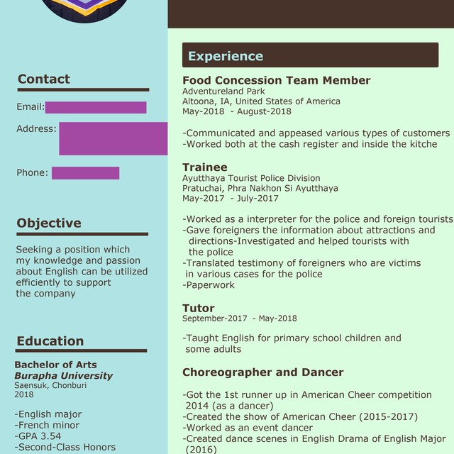 - มีประสบการณ์ฝึกงานเป็นล่ามให้กับตำรวจท่องเที่ยว
