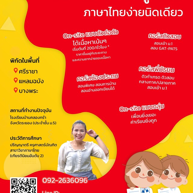 รับติว/สอนเพื่อ เรียน สอบทำคะแนน สอบเข้าเรียนต่อ วิชาภาษาไทย หลักภาษา วรรณคดีและวรรณกรรมหรือเรียนเพื่อแก้ไขปัญหานักเรียนอ่านไม่ออก เขียนไม่ได้(ในเด็ก) สามารถติดต่อเลือกเวลาเรียนได้นะคะ จบคณะครุศาสตร์ สาขาวิชาภาษาไทย มีประสบการณ์การสอนทั้งในโรงเรียน กวดวิชา และตัวต่อตัวค่ะ ได้เนื้อหาแน่นอนค่ะ ^^
