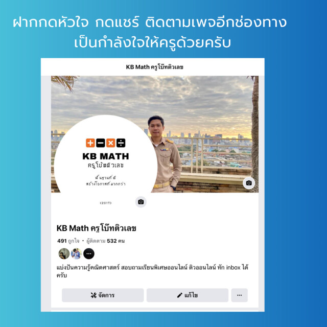 KB Math ครูโบ๊ทติวเลข ปัจจุบันมีลูกศิษย์อยู่แล้วจำนวนหนึ่งแต่เป้าหมายคือ ในอนาคตต้องการพัฒนาให้เป็นสถาบัน จึงได้มาประชาสัมพันธ์หาลูกศิษย์เพิ่มจากช่องทางนี้อีกหนึ่งช่องทางครับ