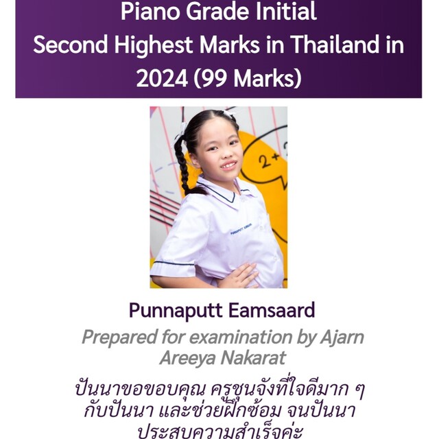 * นักเรียนได้รับรางวัลคะแนนสูงสุดเป็นอันดับ 1 ของประเทศไทยในการสอบเกรด Trinity
