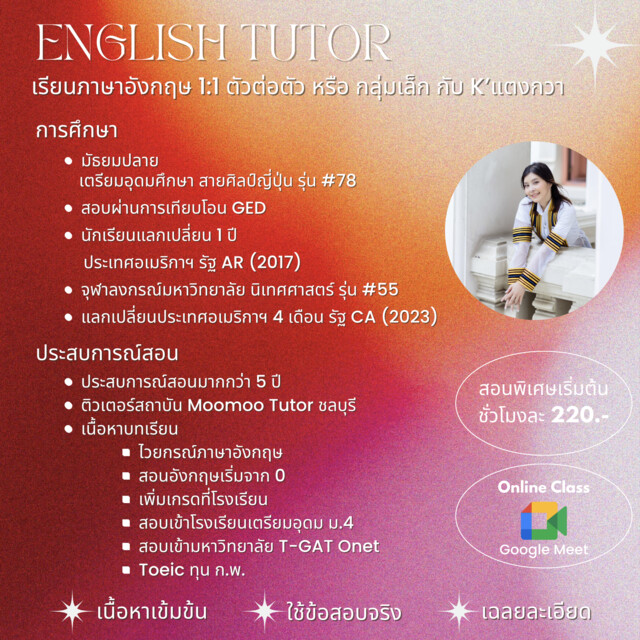 มีประสบการณ์สอน 5ปี ใช้ข้อสอบจริงและข้อสอบจำลองในการติว เนื้อหาปรับให้เหมาะสมกับผู้เรียน ใจดี พูดคุยกันชิลล์ ๆ แต่เนื้อหาแน่น เกร็งข้อสอบ คำศัพท์สอบเข้าให้