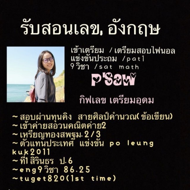 เรียนดี มีประสบการณ์การสอน เข้าใจน้องๆ สอนได้หลายวิชาค่ะ แนะนำน้องๆในดการเตรียมตัวสอบเรียนต่อ หรือเข้ามหาวิทยาลัยได้เป็นอย่างดีค่ะ