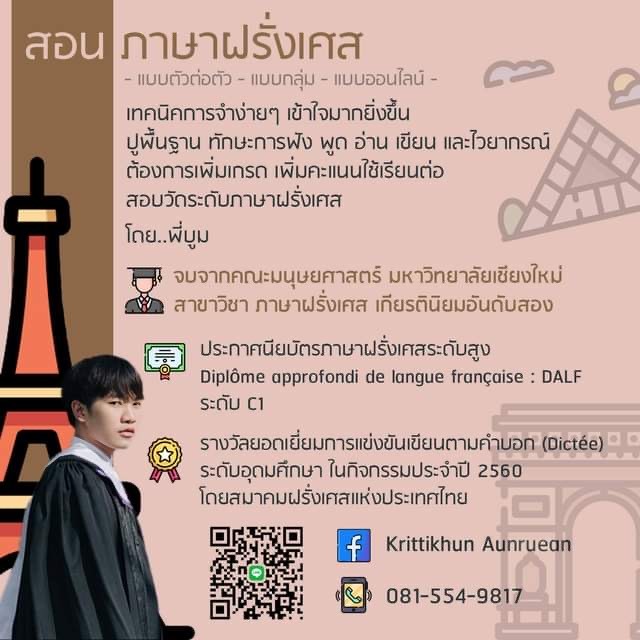 สามารถสอนภาษาฝรั่งเศสให้กับผู้เรียนทุกระดับ ไม่ว่าจะเป็นตั้งแต่ยังไม่มีพื้นฐานเลย ไปจนถึงผู้ที่มีพื้นฐานแล้วแต่ต้องการติวเพื่อนำไปสอบหรือทำงาน สอนด้วยบรรยากาศเป็นกันเอง สนุกสนาน ไม่เครียดนะครับ