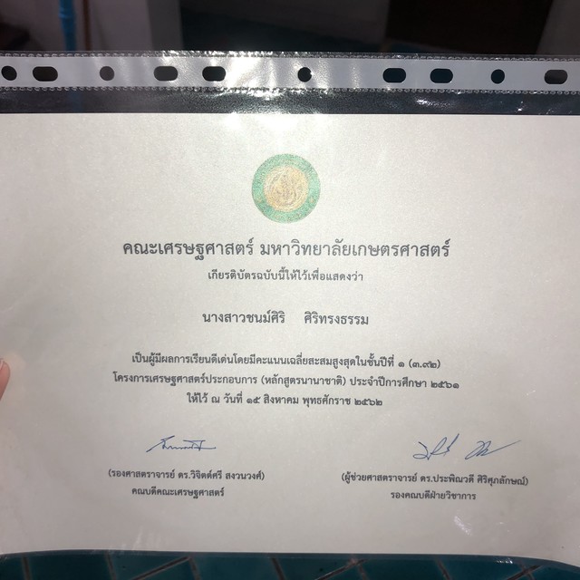 -กำลังศึกษาอยู่ มหาลัยเกษตรศาสตร์ คณะเศรษฐศาสตร์ภาคอินเตอร์ ชั้นปีที่ 2 (ได้รับประกาศนียบัตร เกรดเฉลี่ยสูงสุดในขั้นปีที่หนึ่ง ด้วยเกรด3.92)
