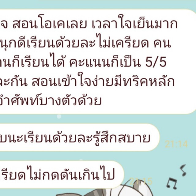 ชอบวิธีการสอนของเหล่าซือมาก ไม่เข้มงวดแล้วก็จะทบทวนให้เสมอ มีวิธีทริคการจำให้ และเป็นกันเองไม่เกร็งเวลาเรียนด้วย