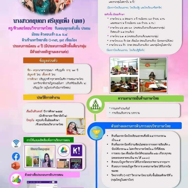 สวัสดีค่ะ ชื่อเตย สอนวิชาภาษาไทยทุกระดับชั้น