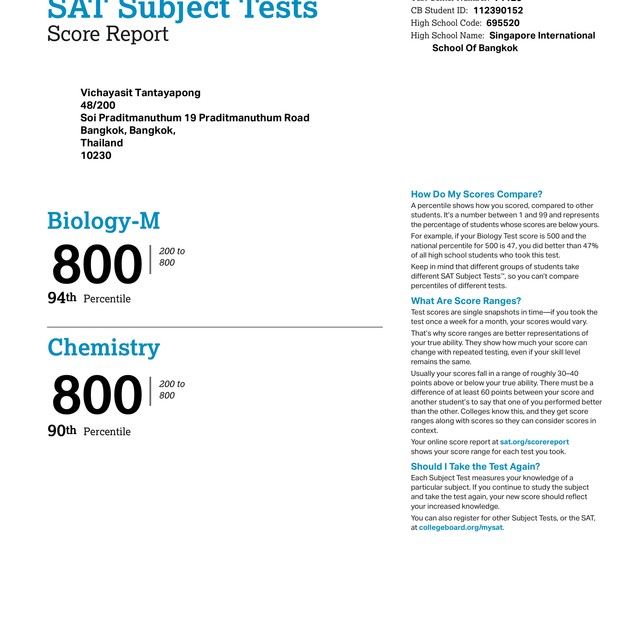 คะแนน SAT Subject Test Chemistry : 800/800