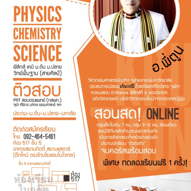 👨🏫 ปกติเคยสอนอยู่ที่ ห้อง517 ชั้น 5 อาคารสยามกิตติ์ สยามแสควร์ ใช้ชื่อ ฟิสิกส์-เคมี อ.พี่ตูน