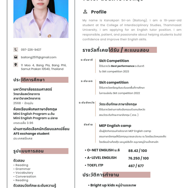 สอนใจเย็น เข้ากับน้องๆได้ดี เตรียมการสอนทุกครั้งที่สอน ปรับชีทการสอนให้เหมาะกับน้องแต่ละคน มีความสามารถทางด้านการสนทนาเป็นภาษาอังกฤษสูง