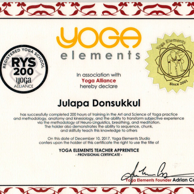 มีประสบการณ์การสอนโยคะทั้งสตูดิโอ แบบกลุ่มและแบบเดี่ยว นักเรียนไม่จำเป็นต้องมีประสบการณ์ หรือพื้นฐานโยคะมาก่อน เพราะคลาสจะถูกออกแบบให้สอดคล้องกับปัญหาและพื้นฐานของนักเรียนในแต่ละบุคคล เริ่มตั้งแต่ระดับพื้นฐานไปถึงระดับสูง