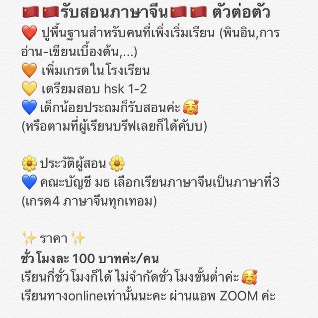 ราคาเบื้องต้นชั่วโมงละ 200 บาทค่ะ แต่ยังไงคุยกันได้ค่ะ อยากสอนและอยากให้ความรู้กับทุกๆคนค่ะ