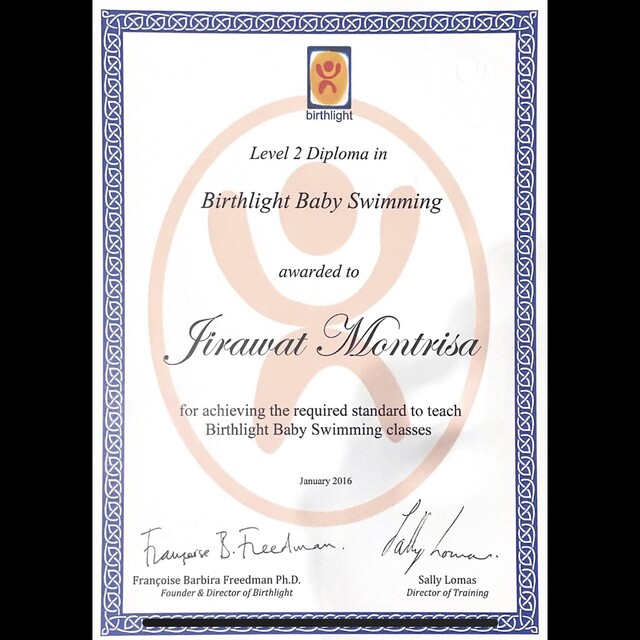 - ผ่านการฝึกอบรบหลักสูตรการสอนว่ายน้ำเด็กเล็ก (Baby Swimming Course ) จากประเทศอังกฤษ (มีใบ Certificate)