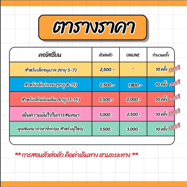 โดยราคาตัวต่อตัว ชั่วโมงละ 300 บาท/ครั้ง