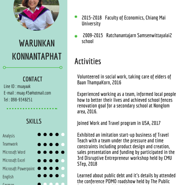 - ประสบการณ์การสอน ให้นักเรียนอนุบาลถึงมัธยมต้น ในโรงเรียนทั่วกรุงเทพ