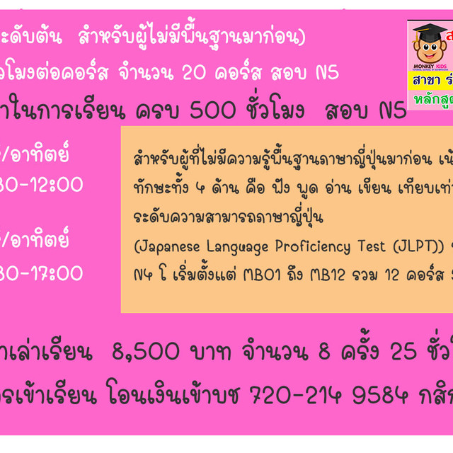 นักเรียนภาษาญี่ปุ่น ที่ รร.สอน เสาร์ อาทิตย์ เวลา ตั้งแต่ 10 โมง เรียนวันละ 3 ชั่วโมง 10 ครั้ง คอร์สละ