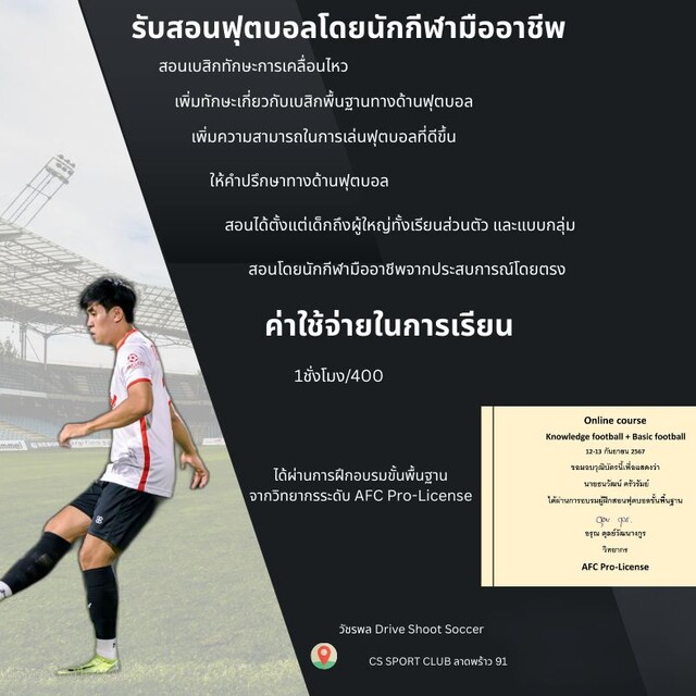 เพิ่มทักษะทางด้านฟุตบอล400 บาท ต่อชั่วโมง