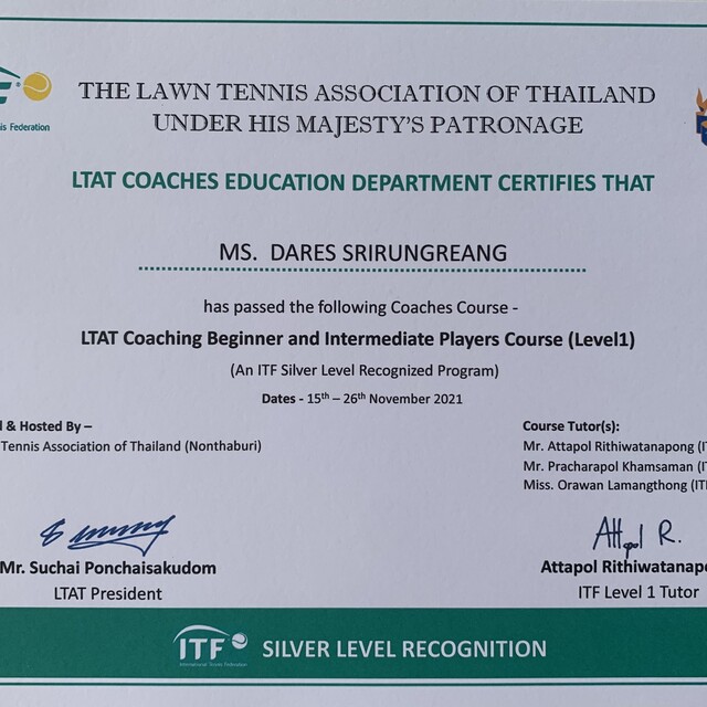 นางสาวดาเรศร์ ศรีรุ่งเรือง รับสอนเทนนิสและเป็นคู่ซ้อมเทนนิสทุกวัยตั้งแต่ระดับเริ่มต้นจนถึงระดับแข่งขัน