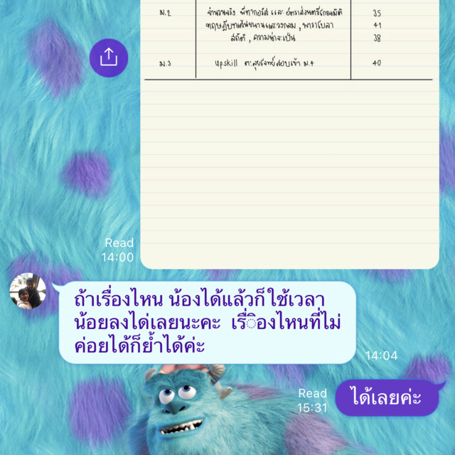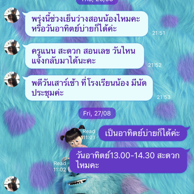 - เรื่องวันเวลาสามารถติดต่อสอบถามได้เหมือนกันค่ะ เพื่อจัดวันเวลาการสอนให้ตรงกับที่คุณสะดวกได้เลยค่ะ