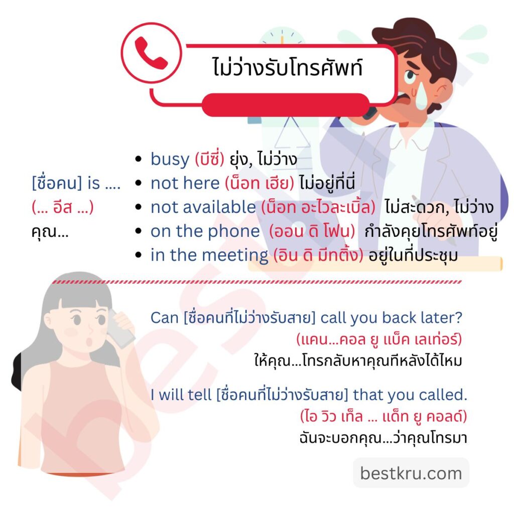 วิธีตอบเมื่อคนที่ต้องการคุยไม่อยู่/ไม่ว่างสนทนาทางโทรศัพท์ภาษาอังกฤษ